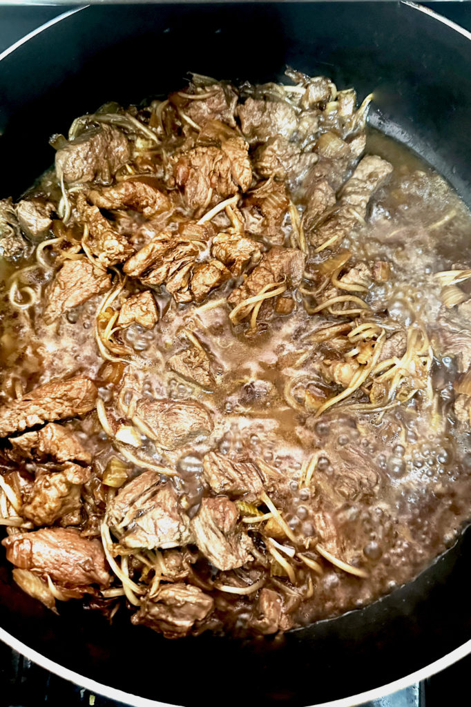 Then, add the bean sprouts and cook them too. If you want your bean sprouts to be a little crunchy, then make sure not to overcook. We don’t like crunchy, so we cook thoroughly.