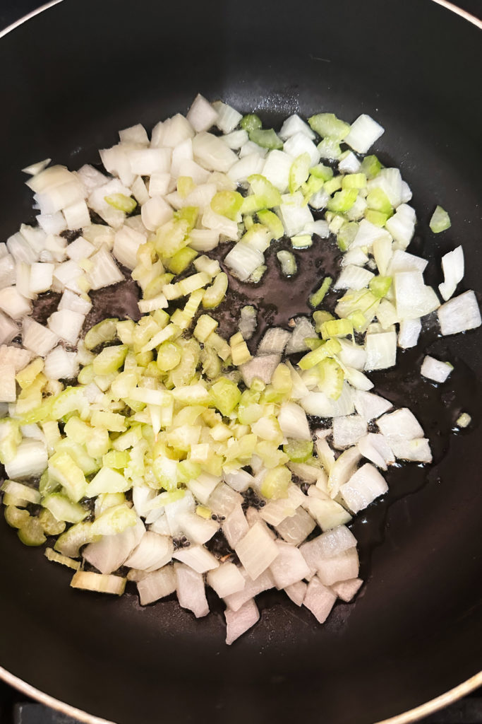 First, fry the onions and celery in a little bit of cooking oil.
