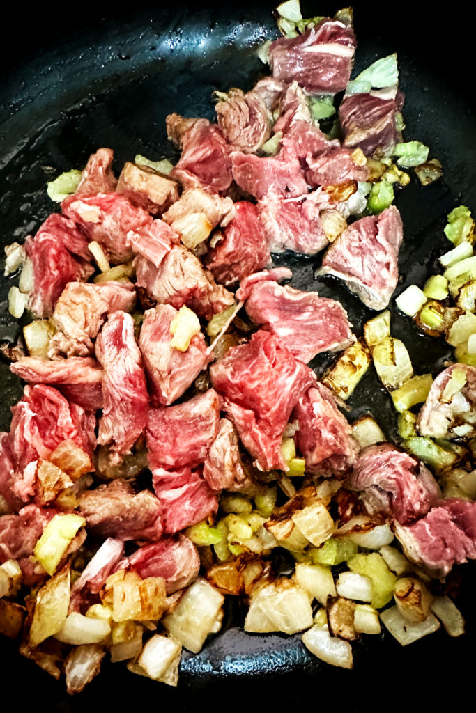 - Add the pieces of meat and saute them as well until cooked.