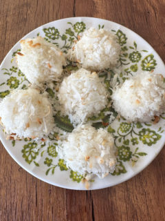 Dairy-Free Coconut Macaroons are a delicate, sweet, coconut treat made from shredded coconut or coconut flakes (as shown in the picture). They’re absolutely delicious and make a great addition to any dessert table.