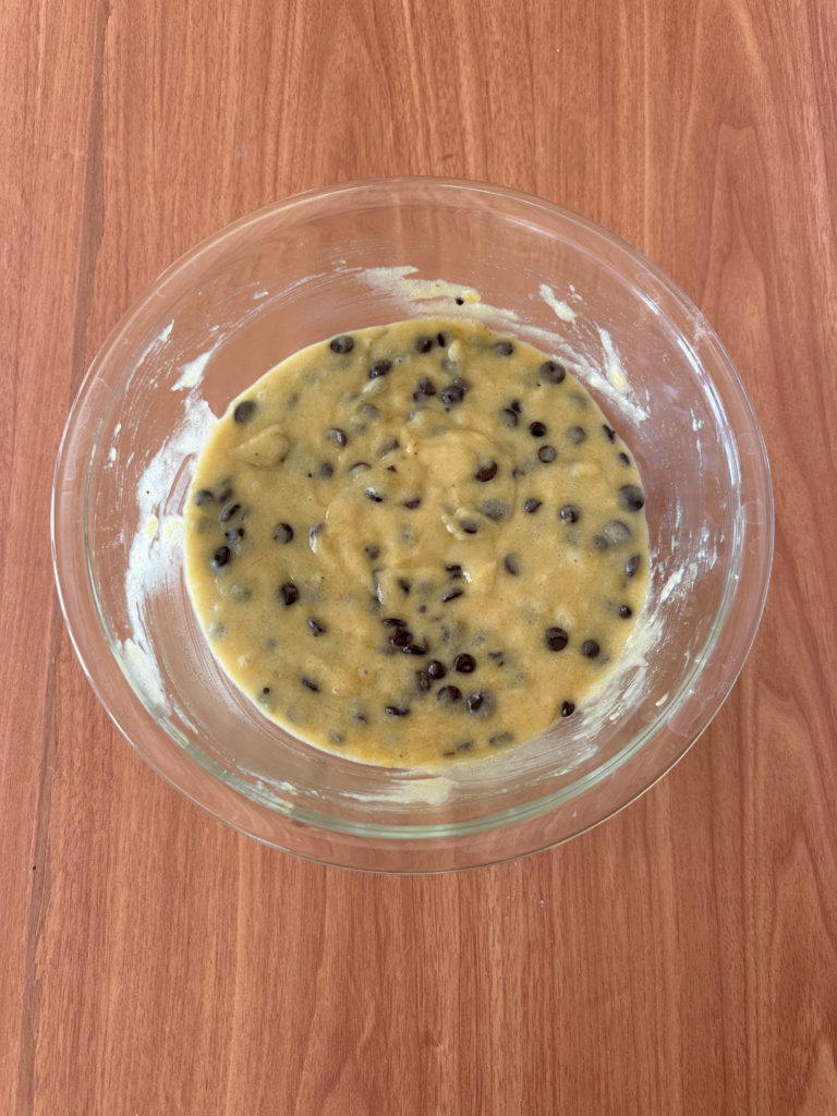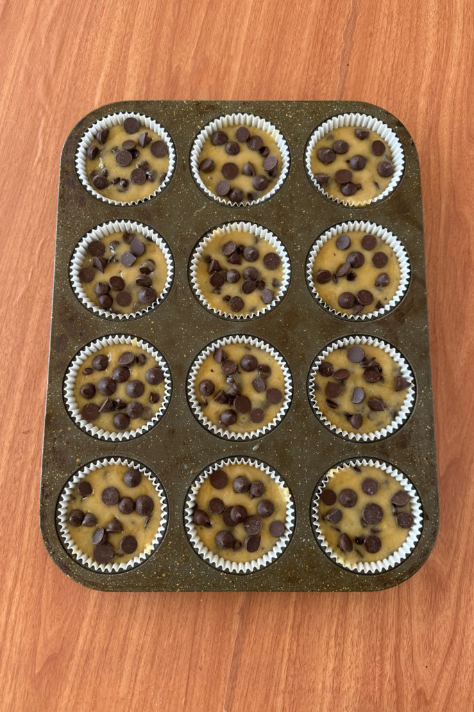 - Using a large spoon or ladle, pour batter evenly into 12 paper-lined or greased standard muffin wells. Take from the remaining chocolate chips and sprinkle on top.