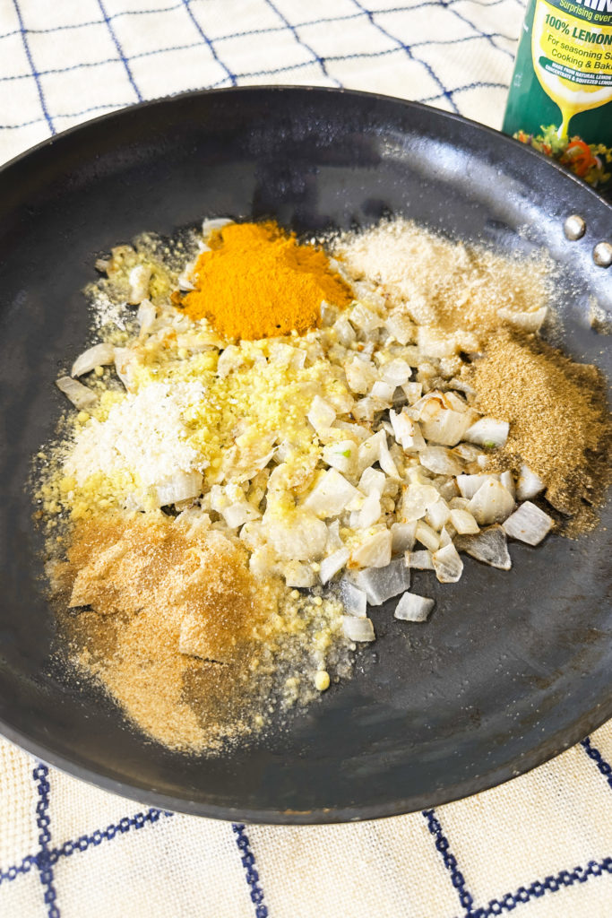 3. Add the consommé powder, turmeric, onion powder, ground cumin, and pepper, if desired. If you like this dish a little tangy, add the splash of lemon juice to taste. Mix well.
