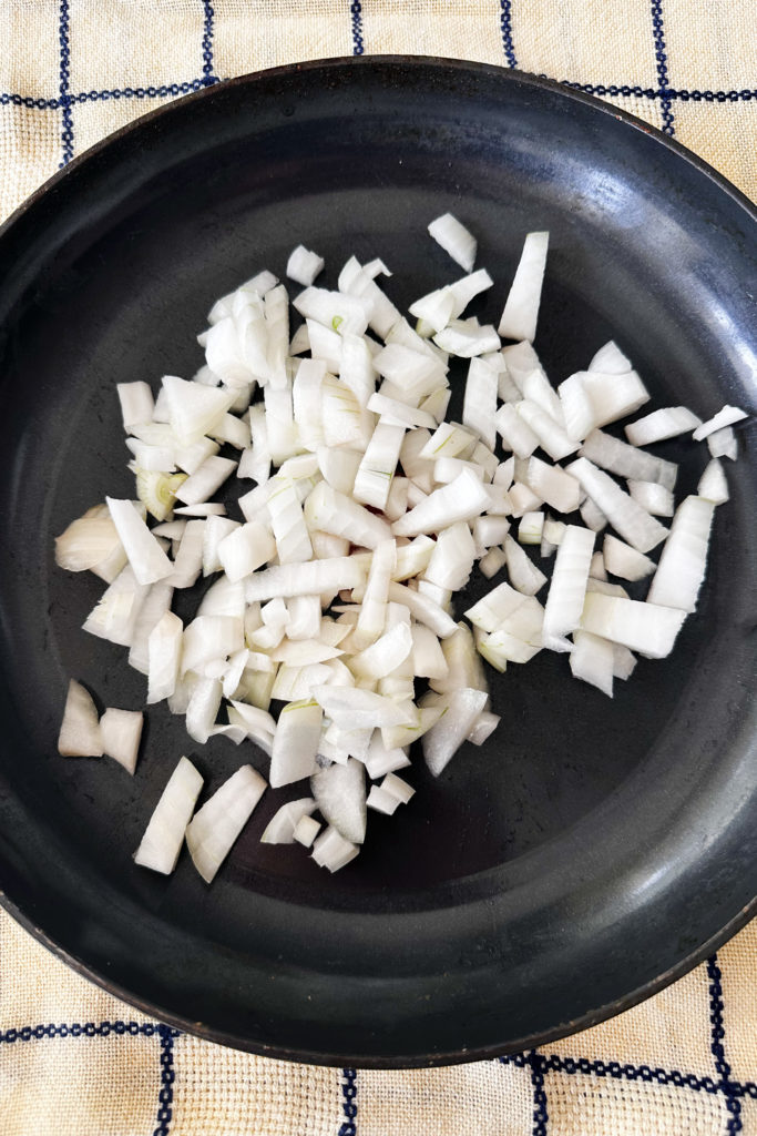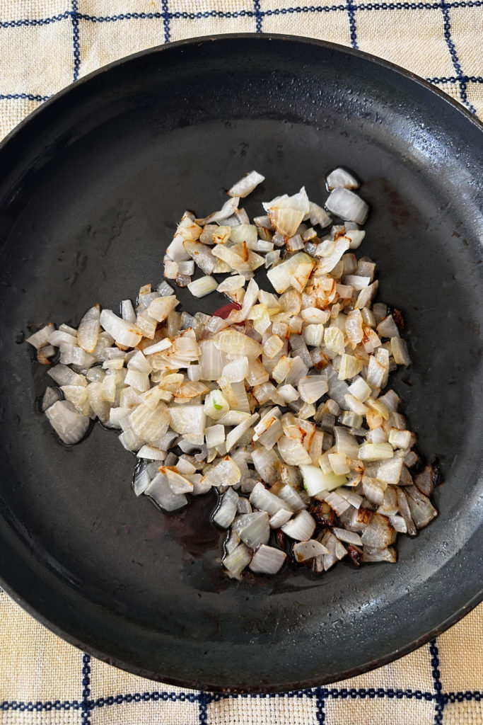 1. Lightly fry the onion with minimal oil in a pot or pan that will be large enough for all of the artichoke bottoms and not be on top of one another.